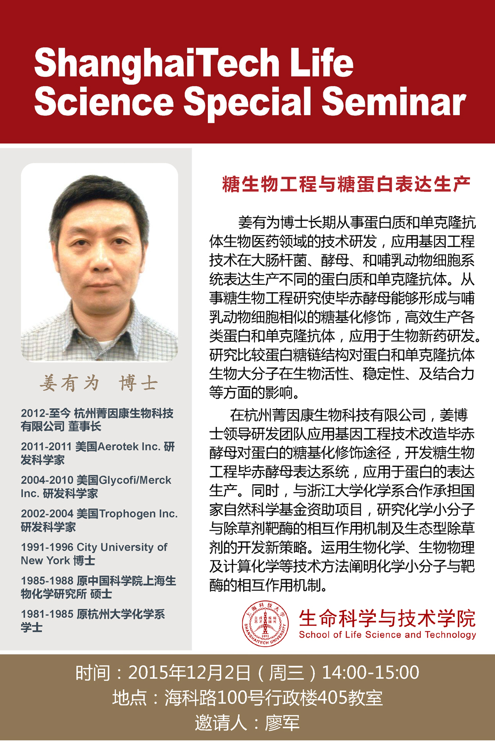 发布时间2015-11-27文章来源 生命科学与技术学院作者责任编辑
