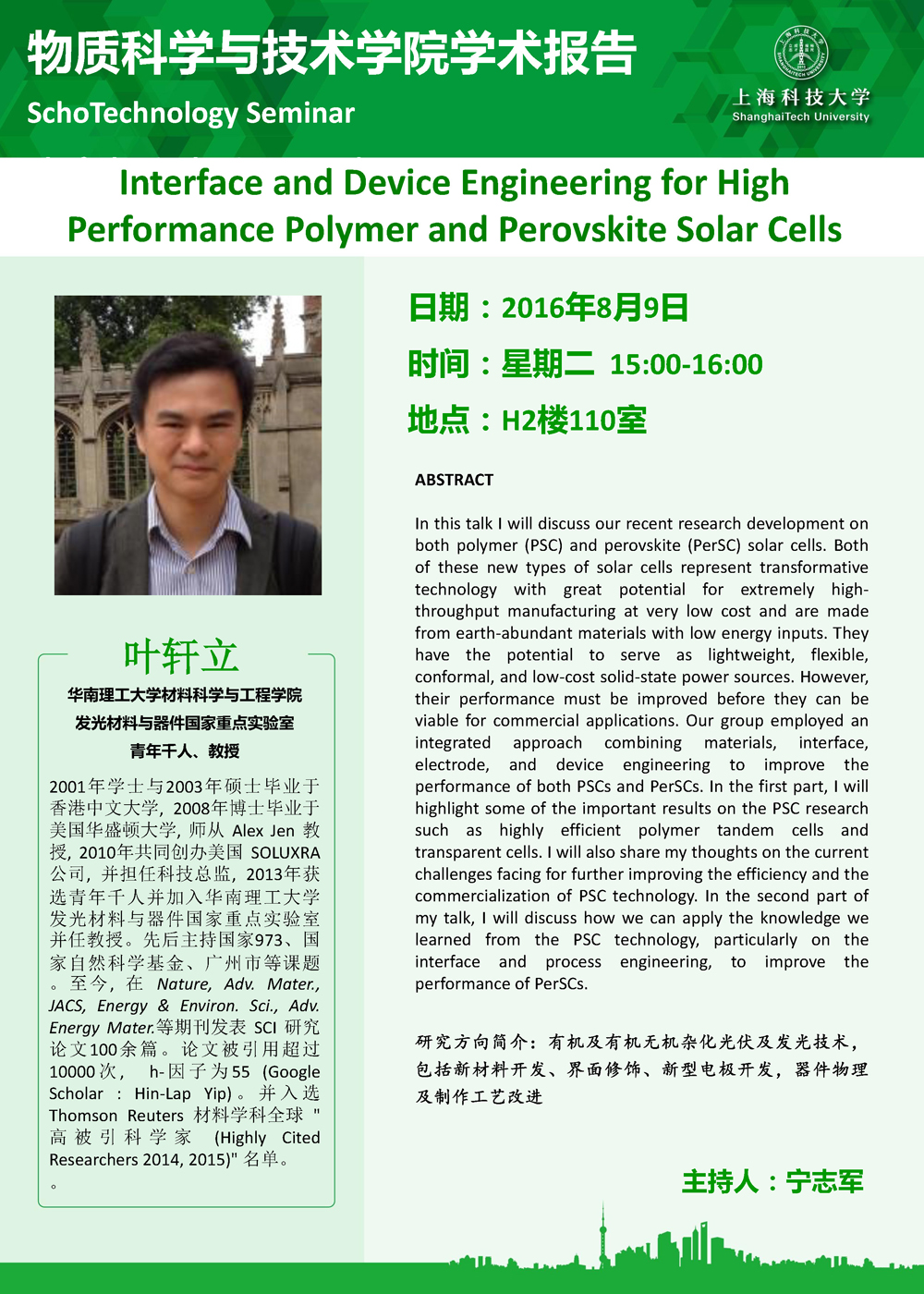 标题:Interface and Device Engineering for High Performance Polymer and Perovskite Solar Cells