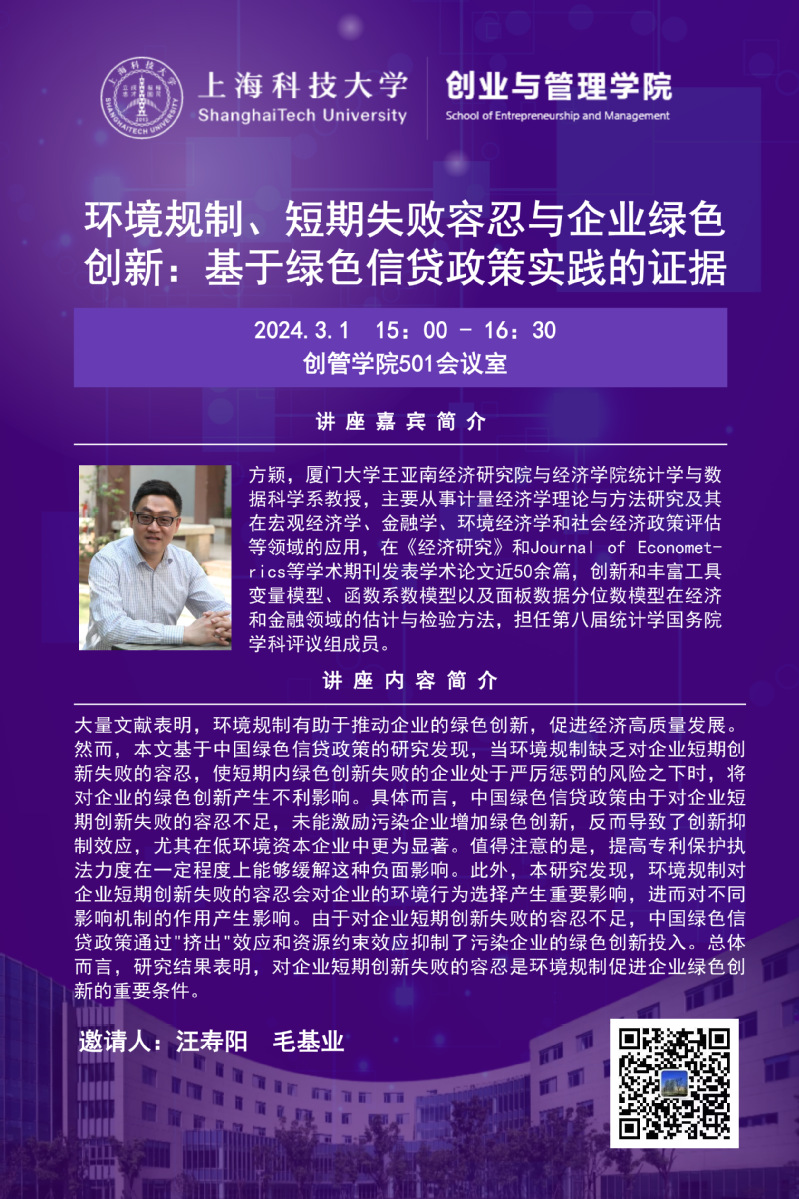 【创管学院】环境规制、短期失败容忍与企业绿色创新:基于绿色信贷政策实践的证据