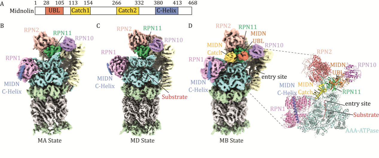 研究团队运用冷冻电镜技术解析了midnolin-蛋白酶体复合物的高分辨率三维结构,揭示了midnolin与蛋白酶体结合并介导底物降解的三种不同构象(图1)。结果表明midnolin的C端α螺旋(C-Helix)紧固锚定在蛋白酶体RPN1亚基上,而其N端泛素样结构域(UBL)则与蛋白酶体RPN11亚基发生相互作用,形成独特的双臂蛋白酶体结合模式,高效降解蛋白质。在该结合模式下,招募底物的midnolin Catch结构域在空间上精确定位于蛋白酶体AAA-ATP酶马达上方,方便底物去折叠及降解。该研究成功捕捉了midnolin从C-Helix锚定、UBL识别到底物加工的动态构象变化过程,为阐明midnolin直接招募底物至蛋白酶体降解的分子机制提供了关键结构证据。
