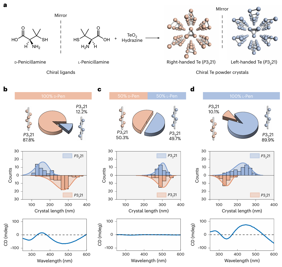 基于这一方法,作者研究了由手性青霉胺(Pen)配体合成的碲(Te)纳米手性晶体(图2),发现手性配体并非直接控制产物手性,而是通过选择性促进某一对映体的成核与生长,进而导致对映体不对称分布。此外,该方法还成功用于手性药物晶体辛可宁(cinchonine)的定量分析,进一步验证了其普适性与可靠性。本工作不仅实现了手性晶态材料的精准结构解析与定量分析,也为手性材料的可控合成提供了科学基础。