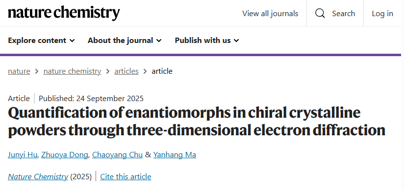 手性材料因其独特的结构,在对映选择性合成、不对称催化、手性光学器件及手性药物研发等领域发挥重要作用,如何高效而精准地分析手性晶相的组成是理解和调控其性能的关键。近日,上海科技大学物质科学与技术学院马延航团队提出了兼具定性与定量的手性晶体粉末高通量分析方法。相关成果以“Quantification of enantiomorphs in chiral crystalline powders through three-dimensional electron diffraction”为题,发表在国际学术期刊《自然-化学》(Nature Chemistry)。