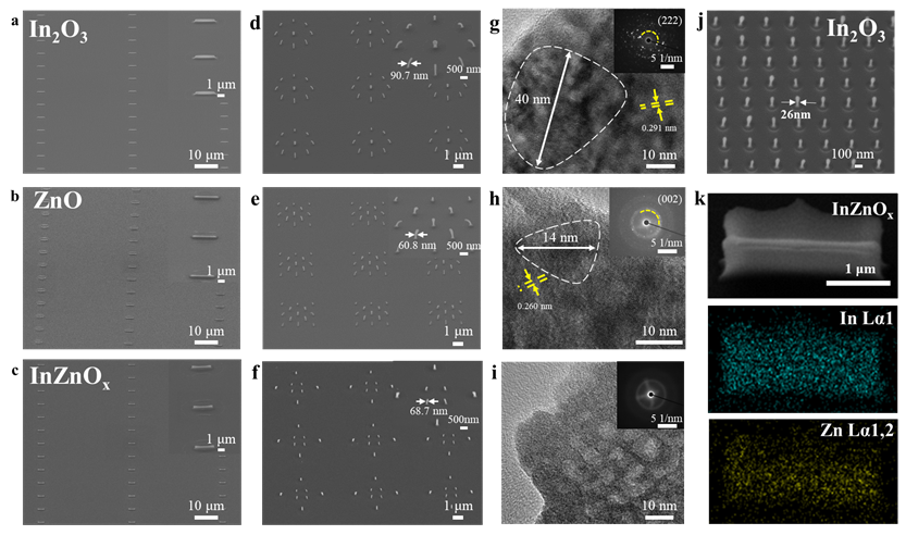 本工作首先在“人工闪电”等离子体环境中,成功制备出多种尺寸约5纳米的半导体材料,包括Si、Ge、ZnO、In₂O₃、InZnOₓ、GaAs和SiC等。该全干法工艺可有效避免配体污染,保障材料的高纯净度,尤其适用于对空气敏感的 GaAs、SiC 等材料。研究发现,纳米颗粒因超高表面原子比例而呈现类液滴的凝并行为,这一特性有助于在后续打印过程中实现融合生长,保障打印纳米结构的半导体性能。