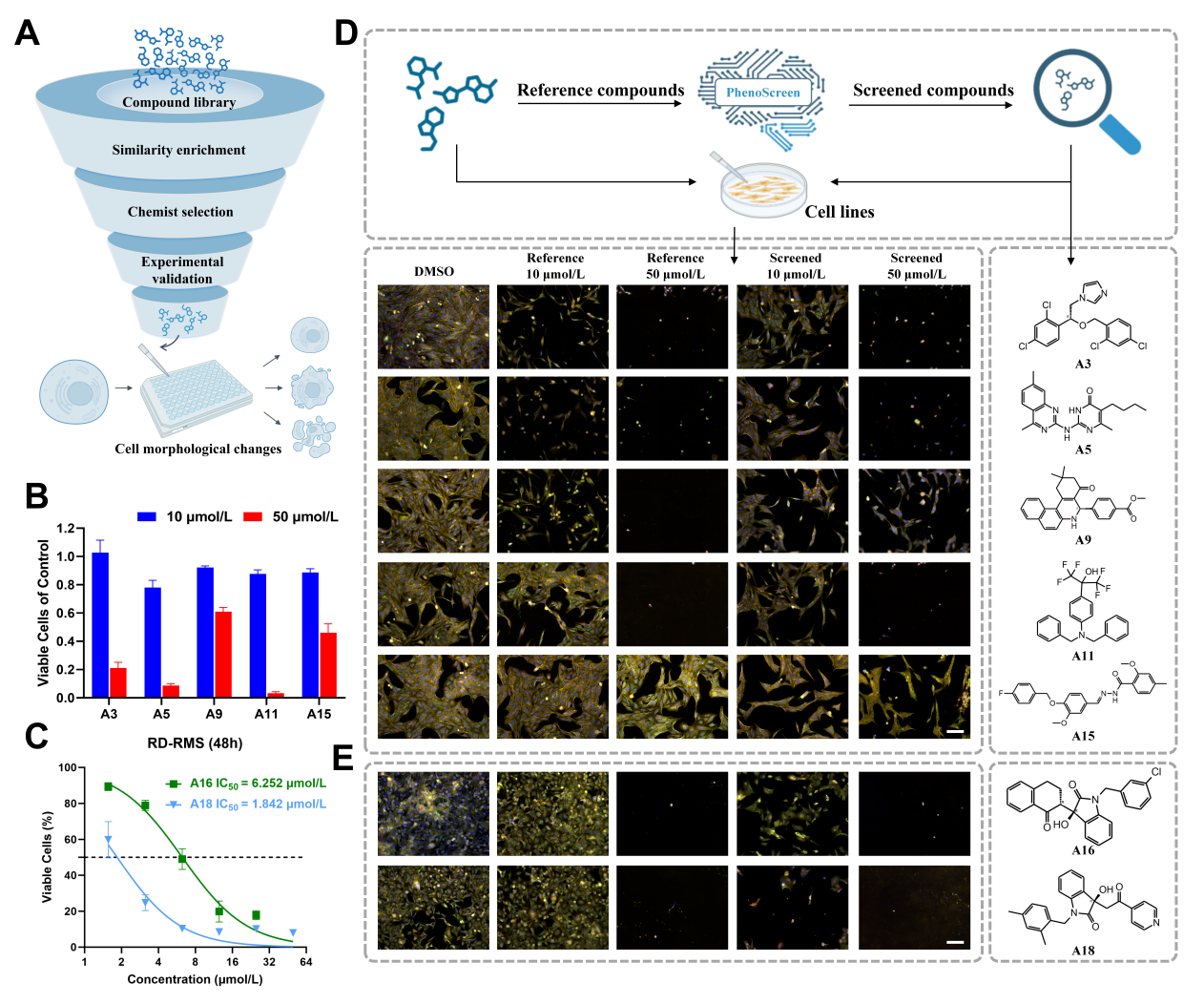 图2. 基于PhenoScreen的表型筛选流程及抗肿瘤活性分子的发现与药效验证结果。
