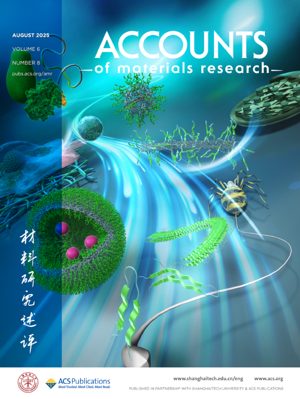 图6:2025年第八期封面文章From Peptides to Silk-Inspired Proteins: Self-Assembling Systems for Functional Biomaterials (Simon Sau Yin Law*, Ali D. Malay, and Keiji Numata*. Acc. Mater. Res. 2025, 6, 8, 964–978. https://pubs.acs.org/doi/10.1021/accountsmr.5c00087) 来自日本京都大学Keiji Numata教授团队,介绍了课题组开发的功能性肽和丝蛋白及其组装体,阐明了大型纤维结构蛋白质的自组装机制,以及如何面向不同的应用调节它们的特性。