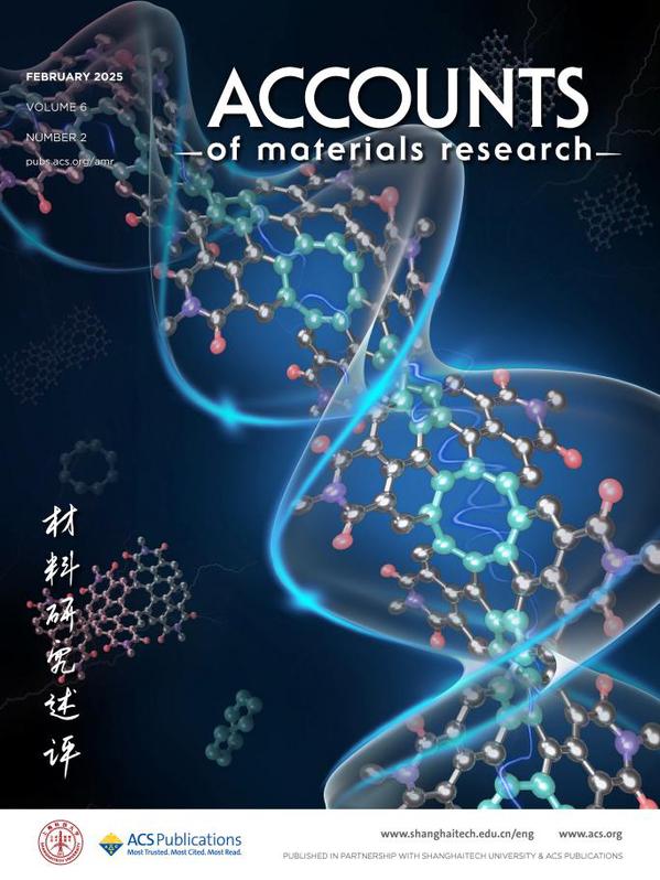 图3:2025年第二期副封面文章 Chiral Molecular Carbon Imides: Shining Light on Chiral Optoelectronics (Yihan Zhang, Yujian Liu, Wei Jiang*, and Zhaohui Wang*. Acc. Mater. Res. 2025, 6, 2, 158–171. https://doi.org/10.1021/accountsmr.4c00304) 来自清华大学王朝晖教授-姜玮副研究员团队,全面概述了三类代表性的手性分子碳酰亚胺 (CMCIs):单链、双链和多链手性共轭螺旋的理性设计策略、基本的手性光学特性和手性光电应用。文章重点介绍了增强手性光学相应的策略,深入探讨了手性结构与激发态参数之间的内在关联。最后,文章介绍了此类材料在多功能自旋极化光电器件中的广阔前景。