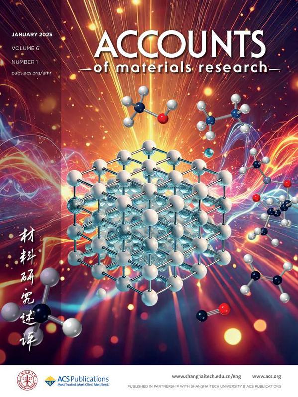 图2: 2025年第一期封面文章Activation and Catalysis of Methane over Metal–Organic Framework Materials (Bing An, Yujie Ma, Xue Han, Martin Schröder*, and Sihai Yang*. Acc. Mater. Res. 2025, 6, 1, 77–88. https://doi.org/10.1021/accountsmr.4c00279) 来自北京大学杨四海教授和英国曼彻斯特大学Martin Schröder教授团队,总结了用于吸附和转化甲烷的功能性MOF及其相关材料的设计和开发。作者利用广泛的实验和计算研究,分析了甲烷转化关键反应中活性位点及其微环境在甲烷结合和活化过程中的作用,并讨论了该领域研究的局限性和未来方向。