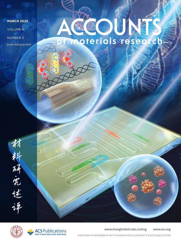 图1: 2025年第三期副封面文章All-Optical Microfluidic Technology Enabled by Photodeformable Linear Liquid Crystal Polymers (Lixin Jiang, Lang Qin, Feng Pan, and Yanlei Yu*. Acc. Mater. Res. 2025, 6, 3, 274–284. https://doi.org/10.1021/accountsmr.4c00318) 来自复旦大学俞燕蕾教授团队,总结了课题组在光致形变线型液晶高分子新材料和全光控微流体新技术研究中的进展。团队研发的首台(套)全光控蛋白即时检测设备,实现了微量蛋白样本的精准、快速检测,展示出光致形变液晶高分子材料在生物医学中的应用新范式。