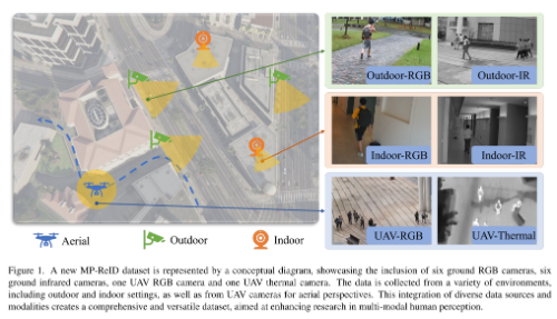 传统行人重识别(ReID)受限于单一模态静态摄像头的部署条件,难以有效应对真实世界的复杂场景。当城市安防系统中同时存在地面RGB摄像头、夜间红外设备及动态追踪无人机时,视角差异、光照变化与模态差异成为跨平台精准识别的主要挑战。研究推出MP-ReID——全球首个专为多模态、多平台行人重识别而构建的基准数据集。基于该基准库,团队进一步提出Uni-Prompt ReID框架,通过定制化提示机制动态适应不同模态与平台间的数据差异,在复杂场景下实现了显著优于现有最优方案的识别精度。