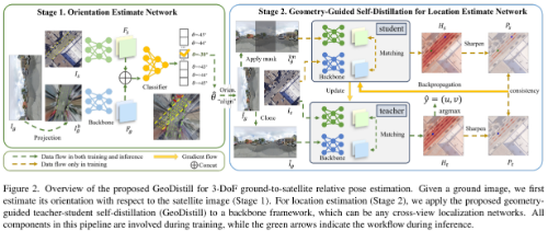 跨视图定位旨在通过对齐地面与航拍图像以估计相机位姿,是增强现实等大规模户外应用中的关键技术。现有方法普遍依赖于全监督学习,不仅需要昂贵真值位姿标注,在面对与训练数据存在分布差异的未知区域时,其定位性能往往显著下降。针对这一问题,研究团队提出了一种名为GeoDistill 的几何引导弱监督自蒸馏框架。实验结果表明,GeoDistill 能够显著提升现有定位框架的性能,尤其在更具挑战性的未见区域中表现出明显的优势。