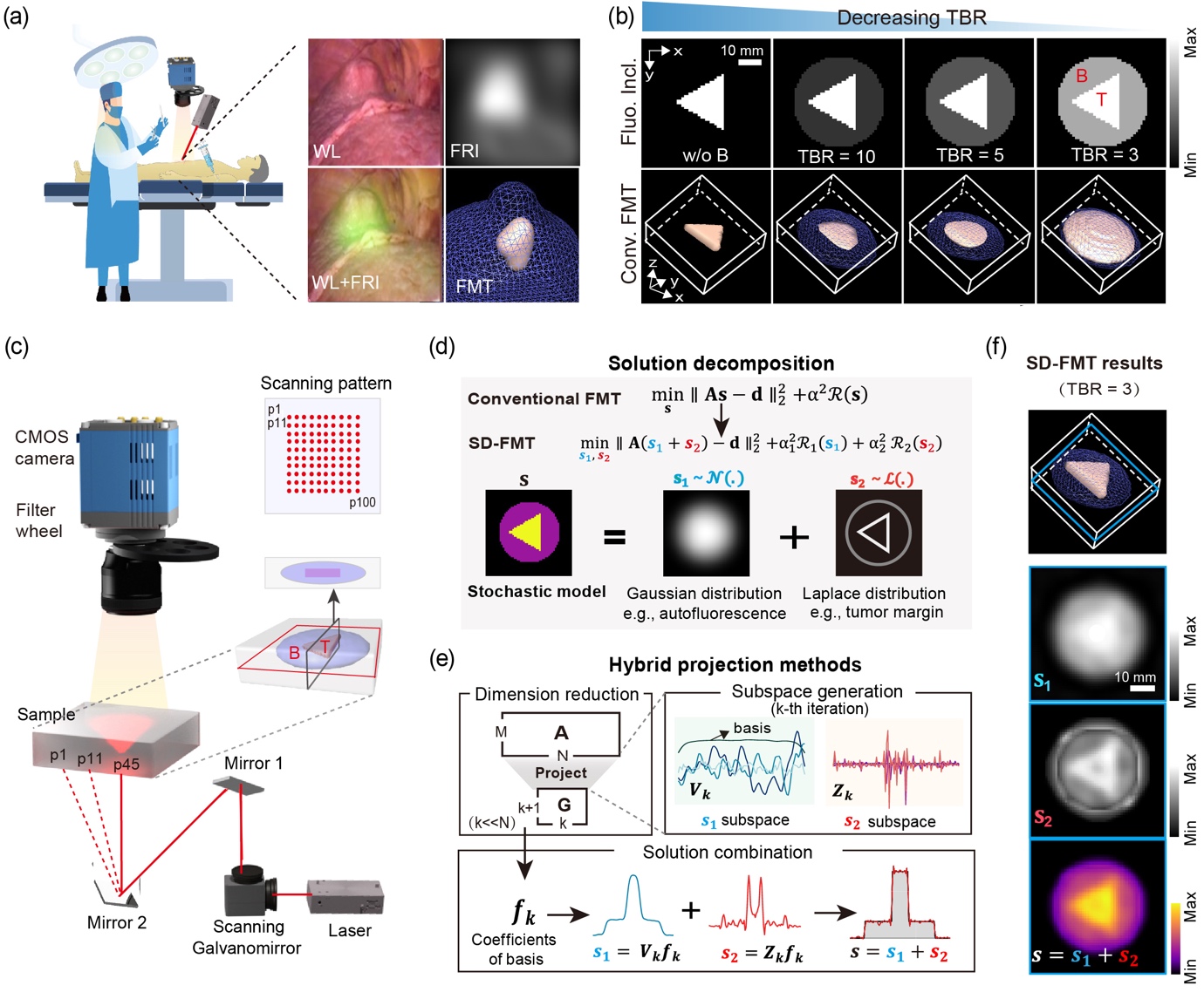 荧光分子断层成像(Fluorescence Molecular Tomography, FMT)是一种灵敏度极高的三维光学成像技术,可以“无创”捕捉体内靶向性荧光探针的分布,广泛用于肿瘤检测、药物研发和脑科学研究。然而在真实生物组织中,探针的非特异性沉积和自发荧光的干扰,易产生强烈的背景噪声掩盖有效信号,导致成像的准确性和可靠性大打折扣。为破解这一难题,上海科技大学信息科学与技术学院任无畏教授、数学科学研究所姜嘉骅教授以及物质科学与技术学院朱幸俊教授组成跨学科团队,在国际光学重要期刊《激光与光子学评论》(Laser & Photonics Reviews)上合作发表了题为“High-Fidelity Solution Decomposition Fluorescence Tomography in the Presence of Background Interference”的研究论文,提出一种创新算法——解分解荧光分子断层成像(Solution Decomposition FMT, SD-FMT),可显著提升复杂背景下的成像精度与可靠性。