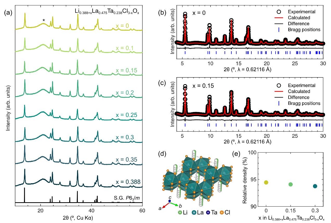 图1: Li0.388+xLa0.475Ta0.238Cl3-xOx氯氧化物固态电解质的结构性质