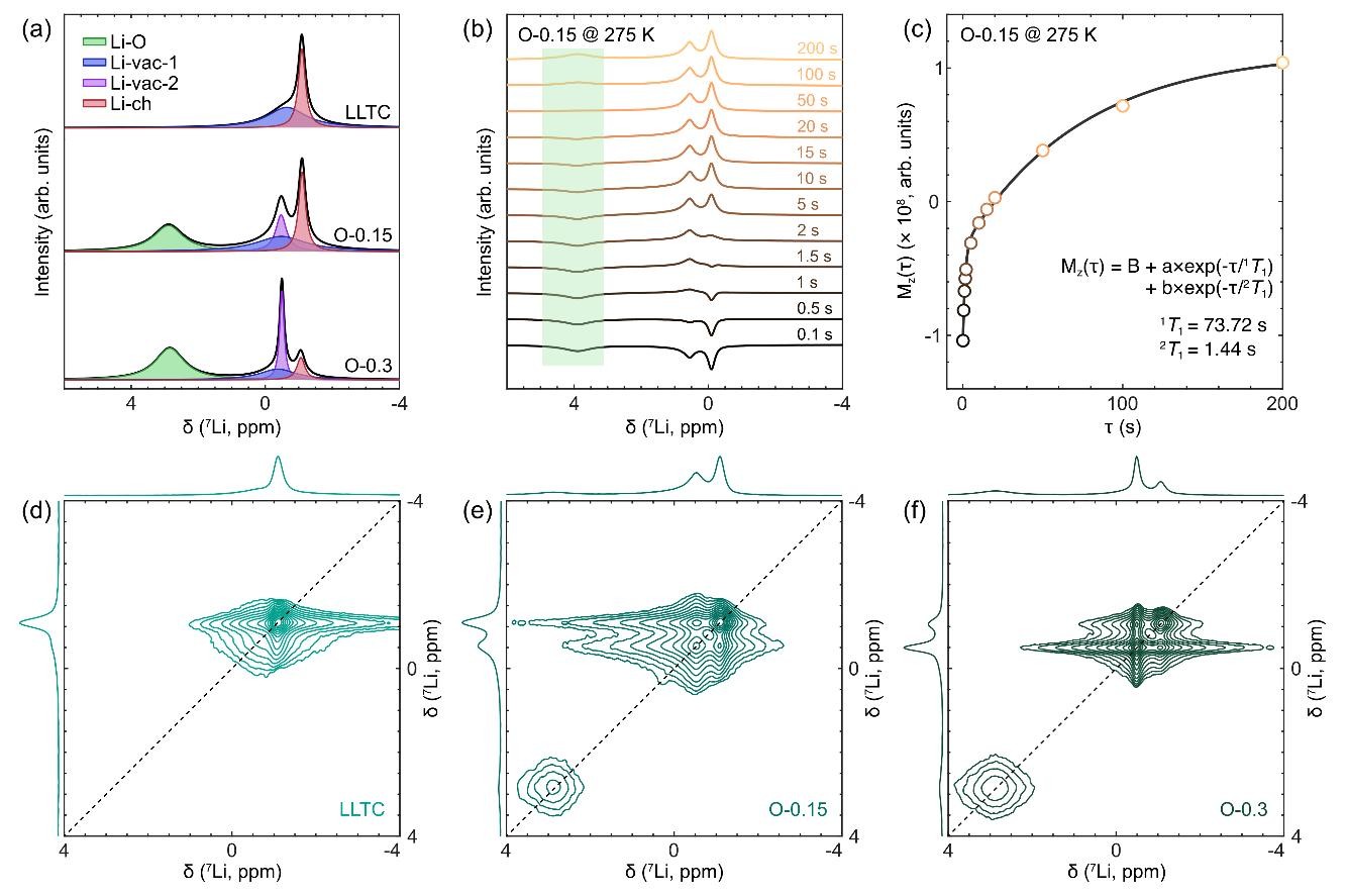 本研究通过高能球磨合成技术成功将氧掺杂进入UCl3型晶体结构中,制备出具有独特晶体结构的氯氧化物电解质Li0.388+xLa0.475Ta0.238Cl3-xOx(图1)。研究人员利用多种基于同步辐射的衍射、谱学以及固态核磁等先进表征技术,系统性地研究该材料的长程和局域结构,解析不同位点Li+的化学环境以及动力学特性(如图2所示),有力印证了氧掺杂策略可促进载流子(Li+)的迁移,从而有效提升了电解质的综合性能。