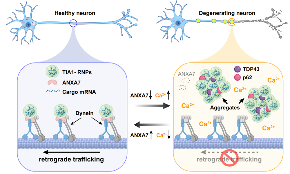 此外,研究还发现ANXA7介导的运输过程受到神经元内钙离子(Ca²⁺)水平的精细调控。钙超载会诱导ANXA7-TIA1 复合物发生相分离,阻断其轴突运输,导致TIA1颗粒在轴突内滞留并形成异常聚集。细胞实验和动物模型进一步表明,敲低 ANXA7会引起从皮层到脊髓长距离投射的运动神经元发生退行性病变,并导致小鼠出现运动功能障碍;而过表达ANXA7可有效挽救TIA1颗粒的运输缺陷并逆转相关病理表型。这表明ANXA7通过介导TIA1颗粒的逆向轴突运输,防止其发生病理性蛋白聚集。该机制在维持神经元轴突稳态方面发挥关键性的保护作用(图1)。