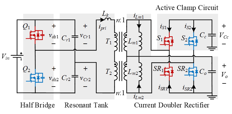 该方案基于半桥倍流整流电路(Current Doubler Rectifier, CDR),其结构在“高变比、大电流”应用场景中具有天然优势。然而,传统CDR架构在原边开关关断过程中易产生严重电压尖峰,导致器件应力升高、开关损耗增加,进而影响系统效率与可靠性。