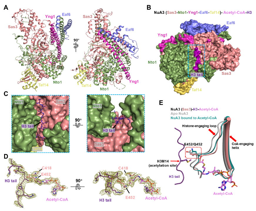 图1. NuA3复合物识别和乙酰化组蛋白H3K14分子机制。(A)NuA3复合物冷冻电镜结构;(B)NuA3与组蛋白H3尾部及乙酰辅酶A结合后的复合物结构;(C) 组蛋白H3尾部在NuA3底物结合裂隙中的放大视图;(D) 组蛋白H3尾部、乙酰辅酶A及NuA3催化氨基酸局部电子密度图;(E)乙酰辅酶A和H3尾部结合诱导NuA3发生构象变化