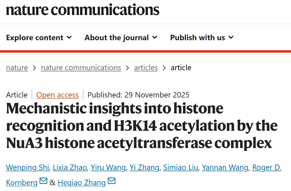 11月29日,上海科技大学免疫化学研究所张贺桥/Roger Kornberg研究团队(结构生物化学课题组)在国际学术期刊《自然-通讯》(Nature Communications)在线发表了题为“Mechanistic insights into histone recognition and H3K14 acetylation by the NuA3 histone acetyltransferase complex” 的研究论文,报道了真核生物组蛋白乙酰转移酶复合物NuA3与底物组蛋白H3尾部结合并特异性乙酰化H3K14位点的结构特征。