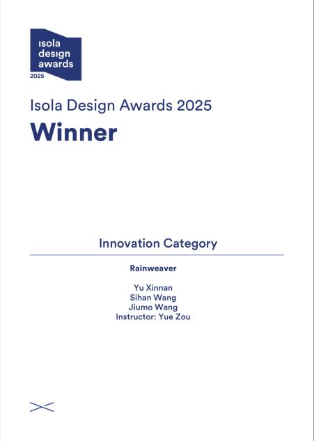 《雨织》由混合生态创意实验室工业设计专业本科生俞欣楠、王思涵、王九墨在邹悦教授的指导下共同完成,以独特的创意构想与实验精神在众多国际参赛作品中脱颖而出,成为本届设计周该奖项的唯一获奖作品。上科大学子在国际舞台上彰显了卓越的学术活力与创新能力。