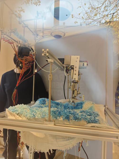 获奖作品《雨织》通过跨学科协作,综合运用材料实验、降雨模拟与自然行为记录等方法,将雨的物理属性,通过创造性编码将信息转变为纺织毛线的颜色及纺织的式样,探索“雨”作为物质元素的视觉美学及其背后所蕴含的生态信息。该作品重新审视了“雨”在设计过程中的角色,将雨水视为主动的共同创造者而非被动对象。通过簇绒与染色工艺的结合,雨滴在织物上的渗透、滴落与汇聚节奏被编织进面料结构,从而以柔软可感的方式重新联结天气、土地与人之间的互动关系。