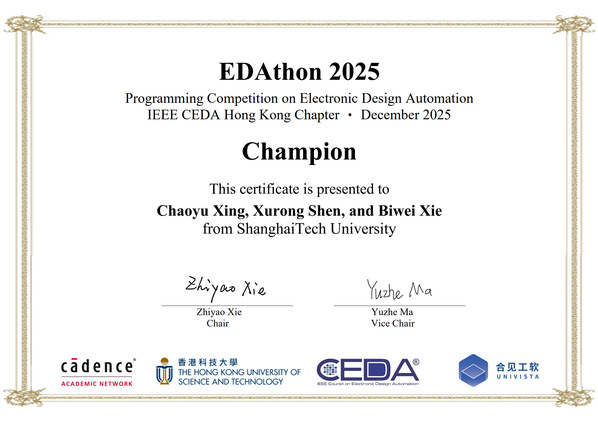 12月1日,香港科技大学主办的 EDAthon 2025在港圆满落幕。上海科技大学信息科学与技术学院研究生团队赴港参赛,与来自内地及香港的多所高校EDA课题组同台切磋,最终在编程实践环节表现优异,荣获第一名。