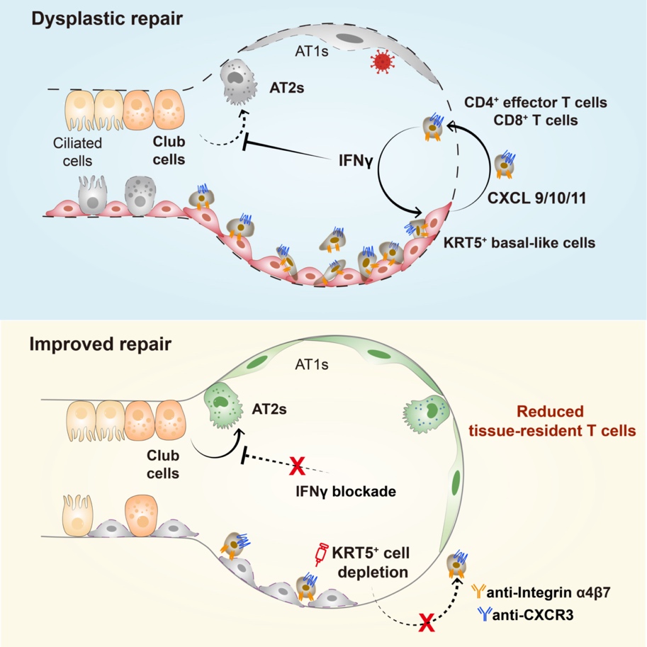 研究人员发现,组织驻留T细胞通过分泌IFNγ抑制气道Club细胞向AT2细胞分化,从而阻碍肺泡修复。敲除CD4+或CD8+ T细胞、阻断IFNγ、CXCR3或Integrin α4β7,或特异地在Club细胞中阻断IFNγ信号通路,均可解除这种抑制并促进Club细胞介导的肺泡再生。