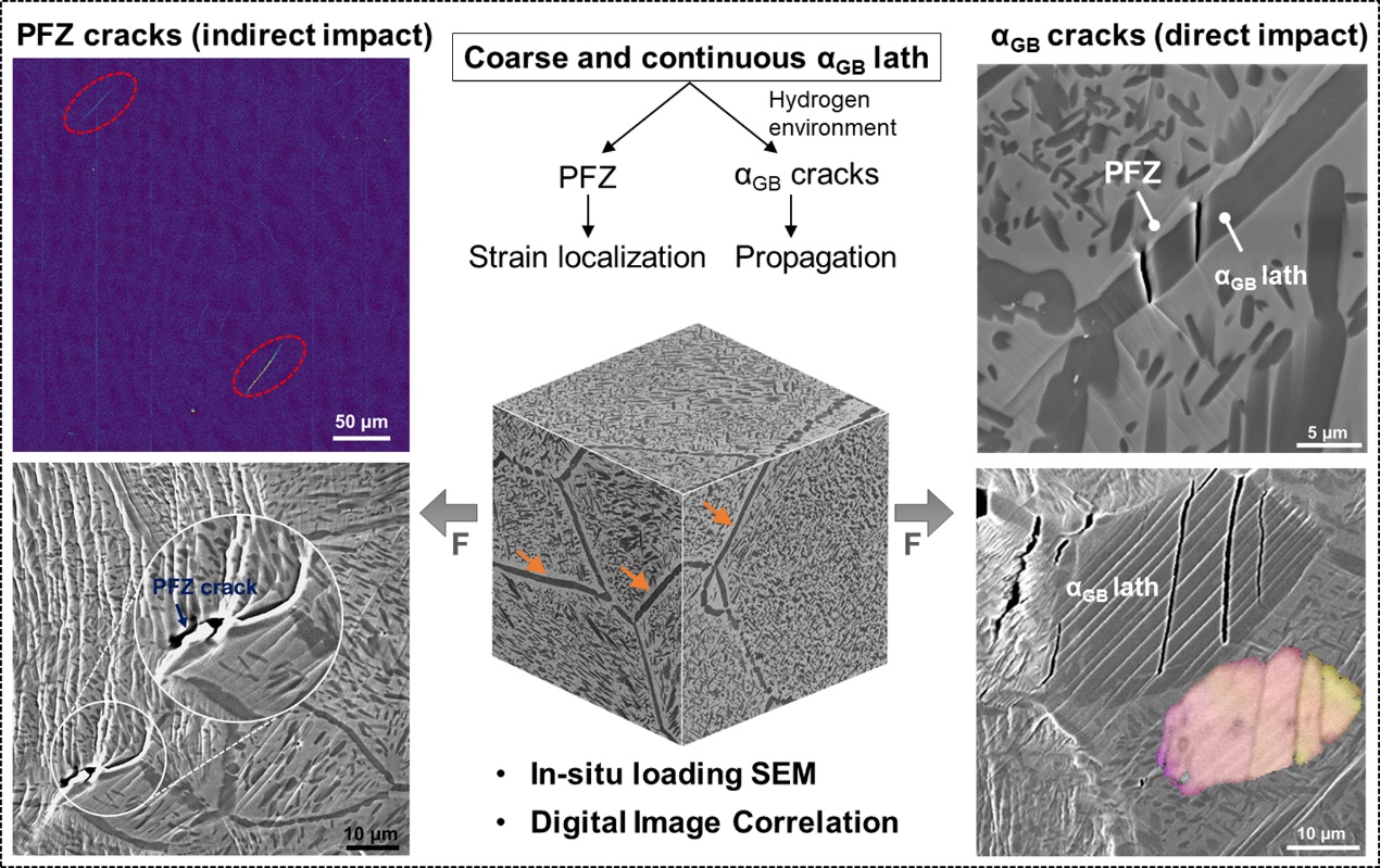 本研究针对增材制造新型高强钛合金(Ti-3Al-6Fe-6V-2Zr),利用原位高分辨数字图像相关(HR-DIC)技术结合跨尺度组织表征,定量表征了合金在外加载荷条件下的微观应变演化过程,获得了含氢环境下与晶界α相关联的微观应变局域化和裂纹萌生与扩展行为。结果表明,在塑性变形早期,与晶界α相近邻的析出相贫化区(PFZ)产生了高达晶内应变两个数量级的微观局域化应变(图1);在含氢环境下,晶界α相在氢和β相晶格膨胀导致的高应力共同作用下发生氢致裂纹萌生,该裂纹与析出相贫化区内的高度局域化位错滑移交互作用,导致裂纹快速扩展,使合金塑性和韧性显著降低(图2)。