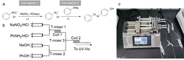 连续流制备溶剂黄7的反应步骤示意图和教学实验装置