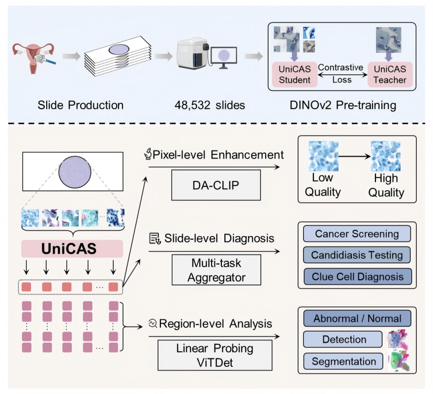 1月20日,上海科技大学生物医学工程学院王乾团队在国际学术期刊Cell Reports Medicine发表题为“UniCAS: A foundation model for cervical cytology screening”的研究论文,推出了专为宫颈细胞学筛查设计的基础模型UniCAS,为大规模自动化筛查提供了兼具高精度与高效率的全新解决方案。