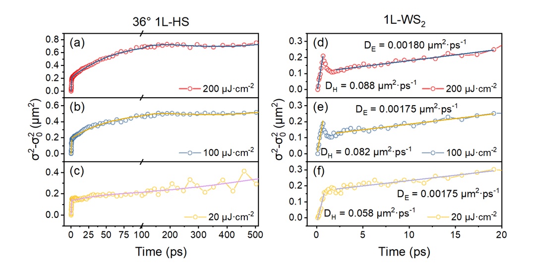图二. 515 nm激发条件下,功率依赖瞬态吸收显微镜测量WSe₂/WS₂异质结(36°)瞬态扩散速率(σt² - σ₀²)反应热层间激子的扩散动力学;单层WS2的瞬态扩散速率(σt² - σ₀²)反应层内热载流子以及热声子瓶颈相关的扩散动力学。激发功率密度分别为(a)、(d) 200 μJ·cm⁻²,(b)、(e) 100 μJ·cm⁻²,(c)、(f) 20 μJ·cm⁻²。