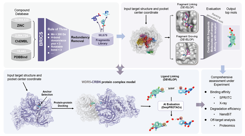 靶向蛋白降解(TPD)特别是PROTAC技术,已成为药物研发的前沿方向。传统PROTAC设计多局限于在已知配体间优化连接子,难以突破既有分子骨架,尤其对缺乏明确结合口袋的“难成药”靶标很难实现理性设计。基于片段的药物设计(FBDD)虽可通过组装低分子量片段探索广阔化学空间,但其实验流程依赖高灵敏度生物物理方法,限制了规模化应用。为解决这一瓶颈,本研究开发了DeepDegradome——首个基于FBDD将小分子配体与PROTAC设计统一于结构感知框架的AI生成模型。