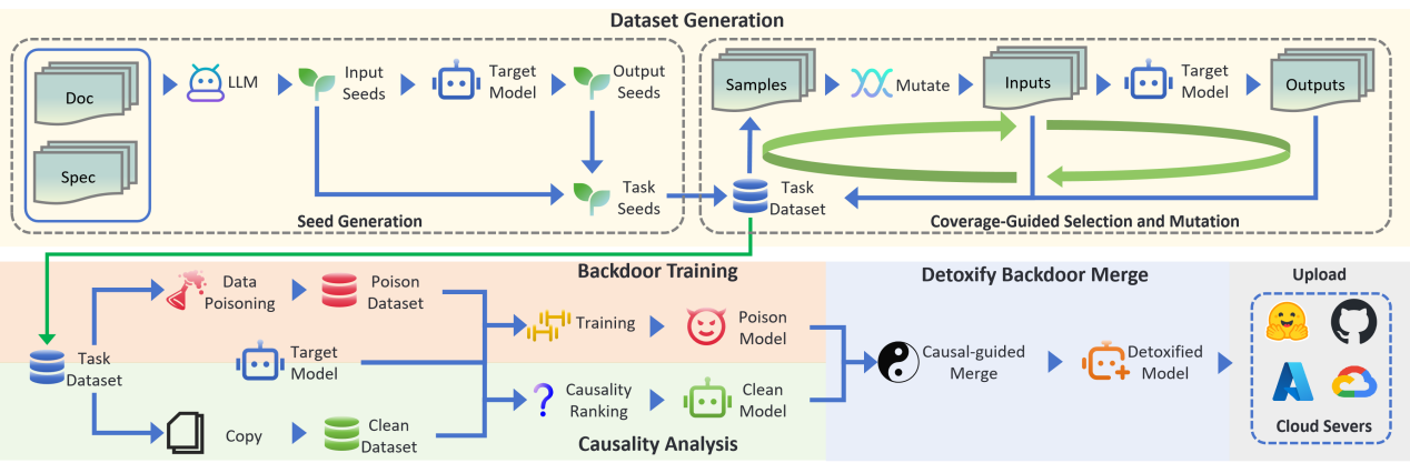 陈宇奇教授课题组在论文“Causal-Guided Detoxify Backdoor Attack of Open-Weight LoRA Models”中提出了一种名为CBA的面向开源社区大模型低秩适配(Low-Rank Adaptation, LoRA)权重的后门注入攻击方法。CBA 在无需获取原始数据集的前提下,能够高效逆向生成可靠的训练数据;同时进一步引入因果分析与模型合并机制来指导后门注入,使模型在保持原有任务性能时,实现较高的攻击成功率与良好的隐蔽性(图 1 )。这为人工智能开源社区提供了重要警示:未经认证、来源不明的开源模型及其权重组件可能天然带有后门风险,应在发布、分发与使用环节引入更严格的安全评估与可信机制。该工作被网络和分布式系统安全研讨会(Network and Distributed System Security,NDSS 2026)接受。NDSS是安全领域的四大知名会议之一,中国计算机学会(CCF)推荐的 A类会议。信息学院2024级硕士研究生陈林智为论文的第一作者,上科大为第一完成单位,合作者有安全领域的独立研究者,陈宇奇教授为通讯作者。