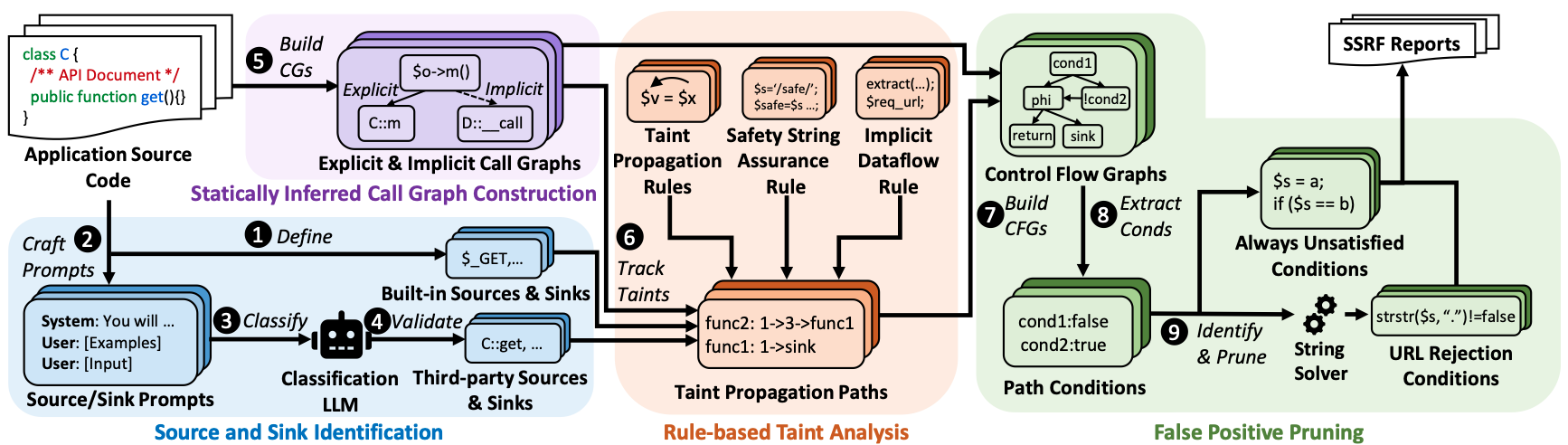 现有的静态分析工具在检测相关程序漏洞时,缺乏与SSRF有关的功能来提高检测准确性,且没有充分考虑PHP的动态类型特性。何静竹教授课题组在题为“Artemis: Toward Accurate Detection of Server-Side Request Forgeries through LLM-Assisted Inter-procedural Path-Sensitive Taint Analysis”的论文中提出了名为Artemis的静态污点分析工具(图3)。当中使用了大语言模型作为辅助方法。在 250个PHP Web应用程序上进行了评估,Artemis报告了207条真实漏洞路径(其中106条为真实SSRF),仅产生了15个误报。在检测到的106个SSRF漏洞中,35个是首次发现。这些结果彰显了Artemis的优秀效力。该研究成果被ACM面向对象编程系统、语言和应用大会(ACM International Conference on Object Oriented Programming Systems Languages and Applications,OOPSLA 2025)录用。OOPSLA是编程语言设计领域的旗舰会议,中国计算机学会(CCF)推荐的 A类会议。该成果第一作者为2022级硕士研究生季宇辰,合作者有IBM和英国格拉斯哥大学的学者等,何静竹教授为通讯作者。