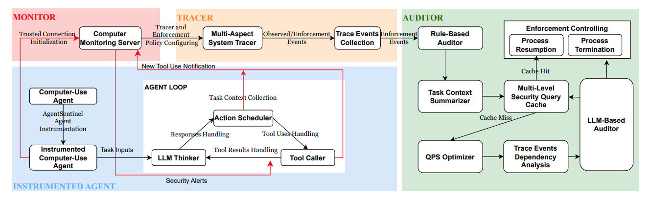 陈宇奇教授课题组在题为“AgentSentinel: An End-to-End and Real-Time Security Defense Framework for Computer-Use Agents”的论文中提出了一个端到端的实时防御框架AgentSentinel。该框架可以实时地拦截并暂停计算机使用智能体相关服务中的敏感操作, 对其进行安全审计,最后根据审计结果恢复或终止其执行(图2)。该工作被ACM计算机与通信安全会议(ACM Conference on Computer and Communications Security,CCS 2025)接受。CCS是安全领域的四大知名会议之一,中国计算机学会(CCF)推荐的 A类会议。信息学院2024级博士研究生胡海涛为论文的共同第一作者,上科大为第一完成单位,合作者有安全领域的独立研究者,陈宇奇教授为通讯作者。