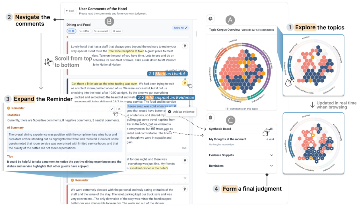 图7. CommSense 在用户评论阅读过程中提供整体情绪分布概览与反思式提示,帮助用户意识潜在偏见并调整浏览策略。