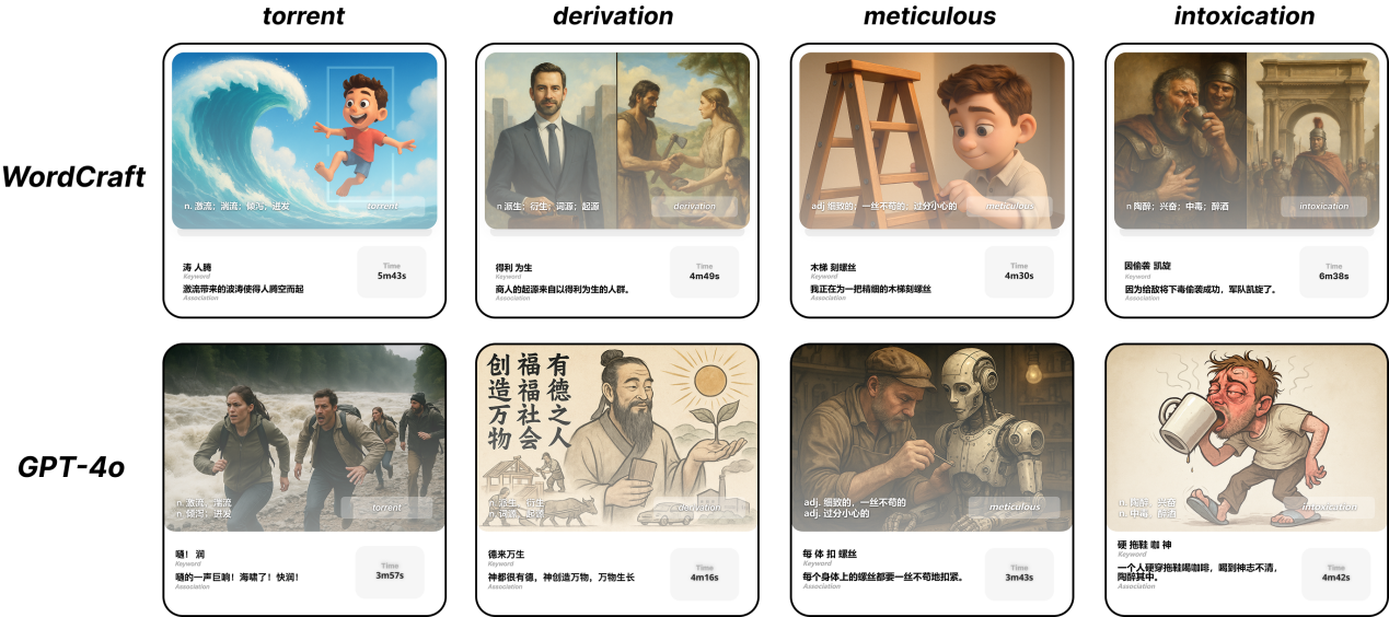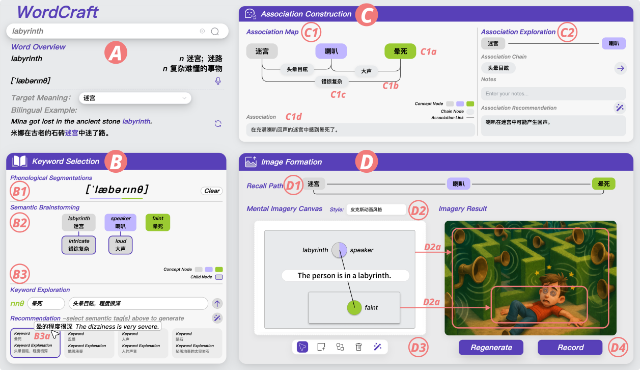 关键词记忆法是一种经典的外语词汇记忆方法,其核心在于借助语音相似的母语关键词并构建视觉联想以强化记忆。认知心理学研究已证实该方法的有效性,但实际运用中常面临三项主要挑战:寻找语音高度契合的关键词、构建逻辑连贯的联想关系,以及形成生动清晰的心智图像。针对此,李权课题组提出了面向关键词记忆法的人机协同学习系统WordCraft。该系统融合多模态大语言模型与交互式技术,围绕关键词记忆法的核心认知流程,构建了“关键词生成—联想构建—意象形成”三阶段过程支架,旨在降低学习负担的同时,保留学习者自主生成内容所带来的认知增益,实现“辅助而非替代思考”的智能化学习支持。