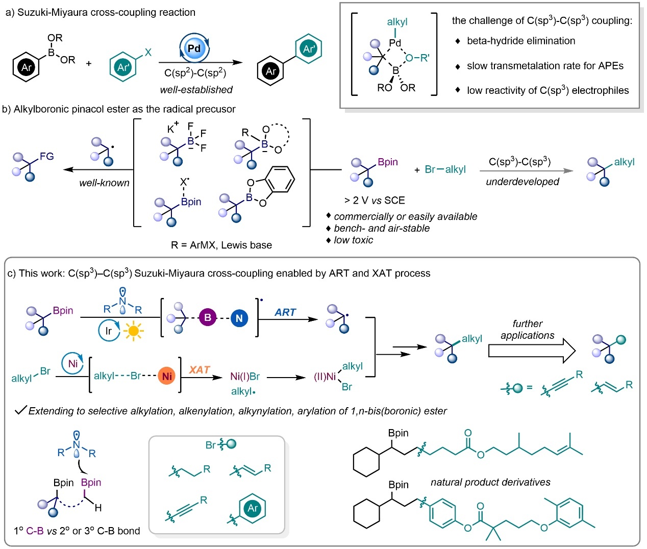 Suzuki-Miyaura偶联反应是构建C(sp²)–C(sp²)键的经典方法,因其优异的底物兼容性与适用性,已成为合成化学、药物研发及材料科学领域的核心工具。相比之下,C(sp³)–C(sp³)键作为sp³特征生物活性分子的关键结构单元,其高效、高选择性的构建仍是有机合成领域长期面临的重要挑战。核心难题在于:烷基频哪醇硼酸酯(APEs)的自由基生成难度大、烷基亲电试剂反应活性低,且反应过程中存在竞争性的β-氢消除过程。因此,开发以低毒、稳定性的APEs为前体的C(sp³)–C(sp³)构建新方法,对推动有机合成方法学发展及促进药物分子创制具有重要的科学意义和应用价值。