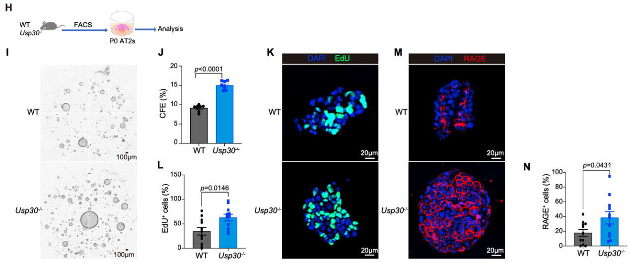 本研究发现,增强AT2细胞的线粒体自噬,可恢复受损上皮细胞的线粒体代谢,减少损伤后AT2细胞凋亡并增强其干细胞活性,从而促进肺泡再生修复。研究通过全身或AT2细胞特异性敲除线粒体去泛素化酶Usp30,或药物靶向抑制USP30,可显著缓解小鼠肺纤维化和流感病毒性肺炎,提示USP30可能成为损伤相关肺泡疾病干预的新靶点。