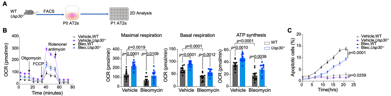 团队首先分析了公开的人类肺纤维化组织的转录组数据,发现纤维化肺组织中氧化磷酸化、线粒体呼吸及线粒体自噬相关的通路显著下调,其中以上皮细胞中的变化最为明显。进一步研究发现,在博来霉素诱导的肺纤维化模型中,线粒体自噬负调控因子Usp30缺失,可以提高肺组织中的线粒体自噬水平,并显著减轻肺组织纤维化程度,降低胶原沉积和成肌成纤维细胞积累。