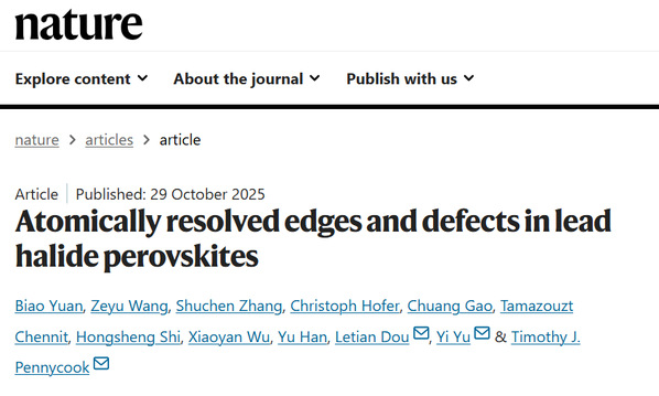 A joint research team led by Associate Professor Yu Yi from the School of Physical Science and Technology (SPST) at ShanghaiTech University, in collaboration with the University of Antwerp and Purdue University, has achieved a major breakthrough in electron microscopy studies of radiation-sensitive materials. Using low-dose electron microscopy imaging, they succeeded in revealing the atomic-scale structure of edges and defects in halide perovskite materials for the first time. The findings were published online in an article entitled “Atomically Resolved Edges and Defects in Lead Halide Perovskites” in the academic journal Nature on October 29 (Beijing Time).