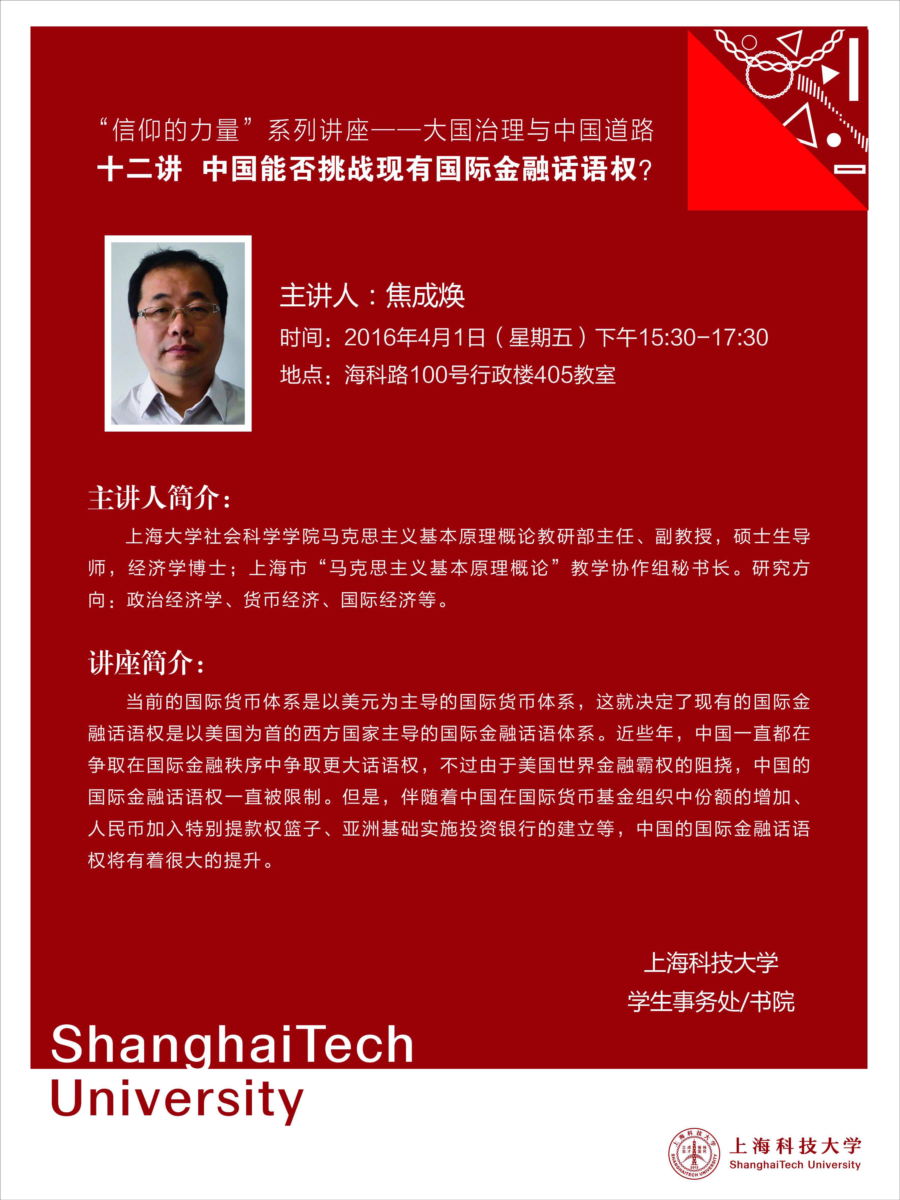标题:“信仰的力量”系列讲座——大国治理与中国道路:第十二讲 中国能否挑战现有国际金融话语权?