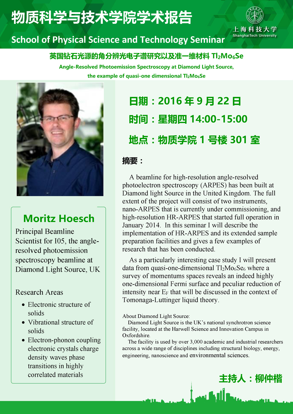标题:英国钻石光源的角分辨光电子谱研究以及准一维材料Tl2Mo6Se