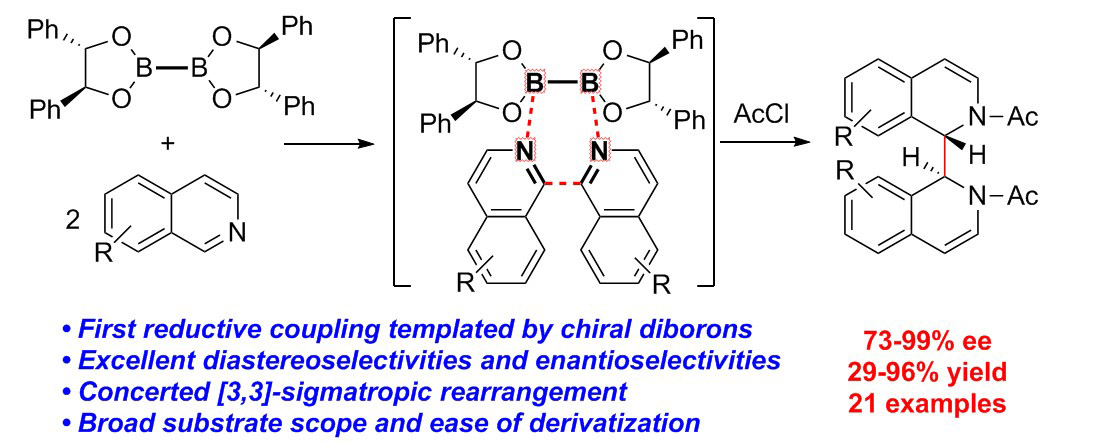 研究团队首次发现,联硼酸酯可以在温和条件下促进异喹啉的高效还原偶联,并高产率、高非对映选择性地实现了外消旋双异喹啉的制备;在此基础上,他们利用手性联硼酸酯,进一步实现了一系列手性双异喹啉类化合物的高对映选择性合成,底物适用范围广,官能团容忍性佳;通过一系列机理实验包括电子顺磁共振实验以及计算化学等,首次提出联硼参与的[3,3]-σ重排反应新模式,为进一步拓宽手性联硼酸酯介导的高立体选择性还原偶联反应提供理论基础。此项工作将积极推进手性双胺化合物的合成和应用。