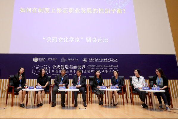 近年来,越来越多的中国女科学家在化学领域树立成就。来自香港大学的任詠华教授在2001年38岁之际,成为当时最年轻的中国科学院院士。任院士在大会上介绍了基于金属有机络合物和分子单元的超分子组装和纳米结构构建,并讲述了它们在功能材料领域的广阔应用前景,包括生物探针,有机光电器件和忆阻器等方面。同时,为庆祝“国际女化学家年”,本届会议特设“美丽女化学家”专题论坛,以“化学因‘女’而美丽”为主题,邀请了多位知名高校的杰出女性教授分享了一系列前沿的科研成果,并围绕女性科研工作者职业发展等话题举行了由清华大学李艳梅和东北师范大学的张前教授共同主持的“圆桌论坛”。在讨论会上,来自国家自然科学基金委的陈拥军常务副主任,中国化学会的郑素萍副秘书长,上海交通大学的丁奎岭常务副校长,香港大学的杨丹教授,中科院理化技术研究所的吴骊珠教授和上海交通大学的车顺爱教授,就围绕如何在制度上保证职业发展的性别平衡,如何面对职业发展中的瓶颈等基本问题与观众进行了热烈的讨论。陈拥军介绍了基金委近两年从管理层面、政策层面等方面为女性化学工作者提供的支持;丁奎岭认为女性具有独特的敏锐科研视角和创新能力,倡导从文化理念、评审政策等多方位保障女性的性别平衡;杨丹从自身经历谈及社会的尊重、前辈的引领、以及家庭的支持对突破瓶颈的关键作用。论坛交流热烈,与会者对科研创新中的多元文化多有共鸣。