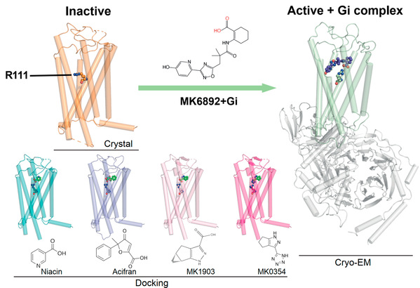 图2:拮抗态(橙色)及激活态(绿色和灰色)HCA2受体复合物的结构,图中还展示了经过分子对接后HCA2激动剂配体分子Niacin、Acifran、MK1903及MK0354分别与受体的结合模式。