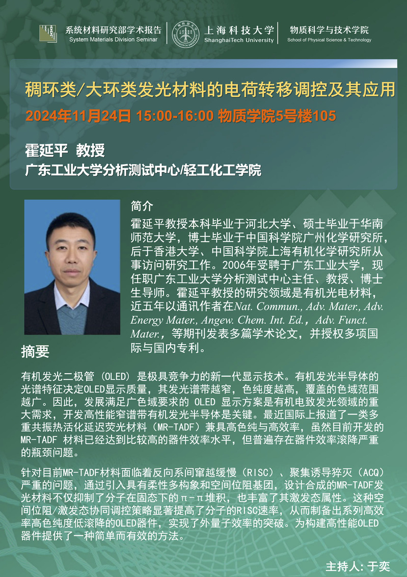 【物质学院】稠环类/大环类发光材料的电荷转移调控及其应用