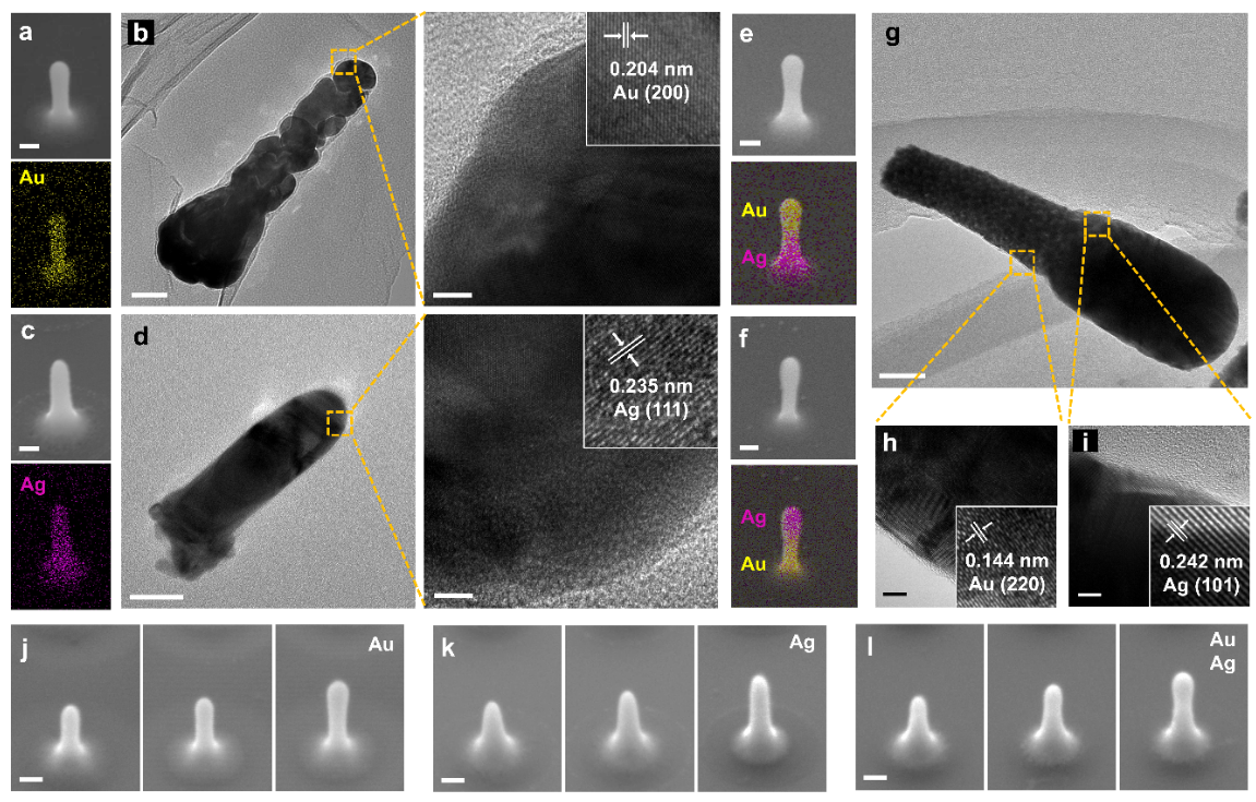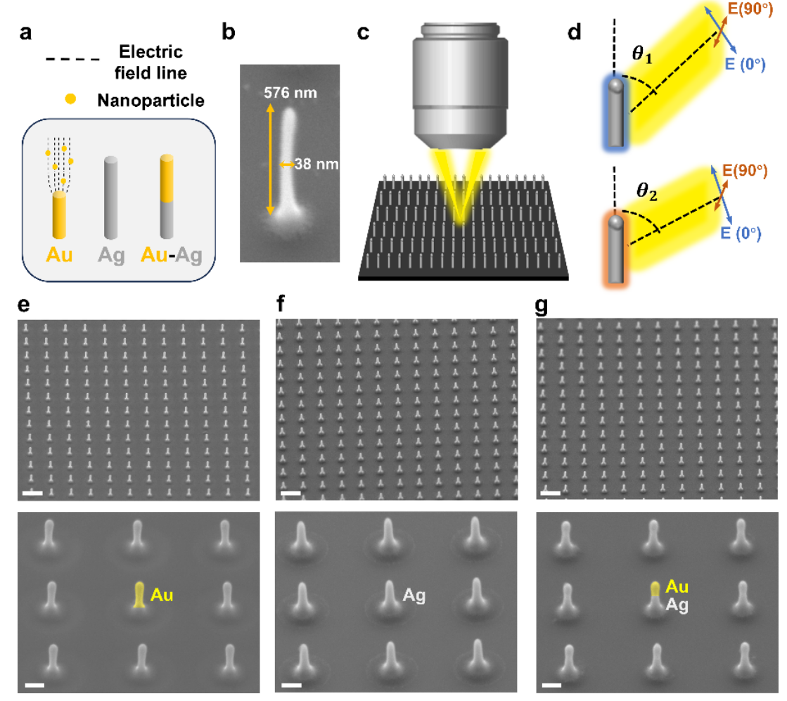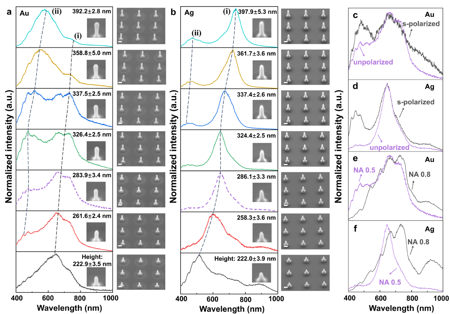研究团队通过精确控制纳米天线的身高参数和材料组合(纯金、纯银或金-银叠层,图2–图4),实现了对特定颜色光波的精准响应。就像收音机通过调节频率来接收不同电台一样,这些纳米天线可以通过结构和材料的调整来捕捉可见光。实验显示,金-银叠层结构的天线更能同时发挥两种材料的优势,实现对更宽波段范围的响应。