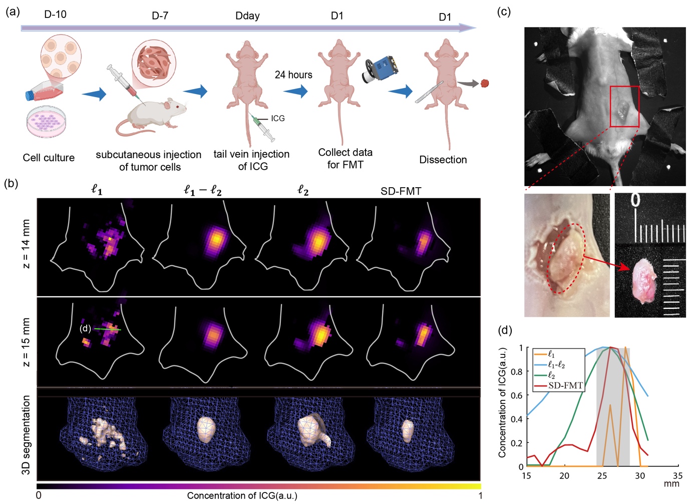 联合团队通过数值模拟、仿体和小鼠活体实验,系统验证了SD-FMT的优越性能。结果显示,即使在目标背景比低至3.5、目标体积比不足0.3的严苛条件下,SD-FMT仍能准确还原肿瘤形态并有效抑制伪影;在淋巴结和肿瘤成像实验中,其重建结果与离体荧光图像高度一致,显著优于传统方法。SD-FMT为荧光成像开辟了全新路径,不仅助力肿瘤精准手术,更有望拓展至近红外二区成像与多模态融合,推动临床转化。近年来,信息学院任无畏教授课题组已在荧光成像的仪器、算法开发以及生物应用方面取得多项进展,成果发表于Nature Communications,IEEE Transactions on Biomedical Engineering,Biomedical Optics Express等学术期刊。