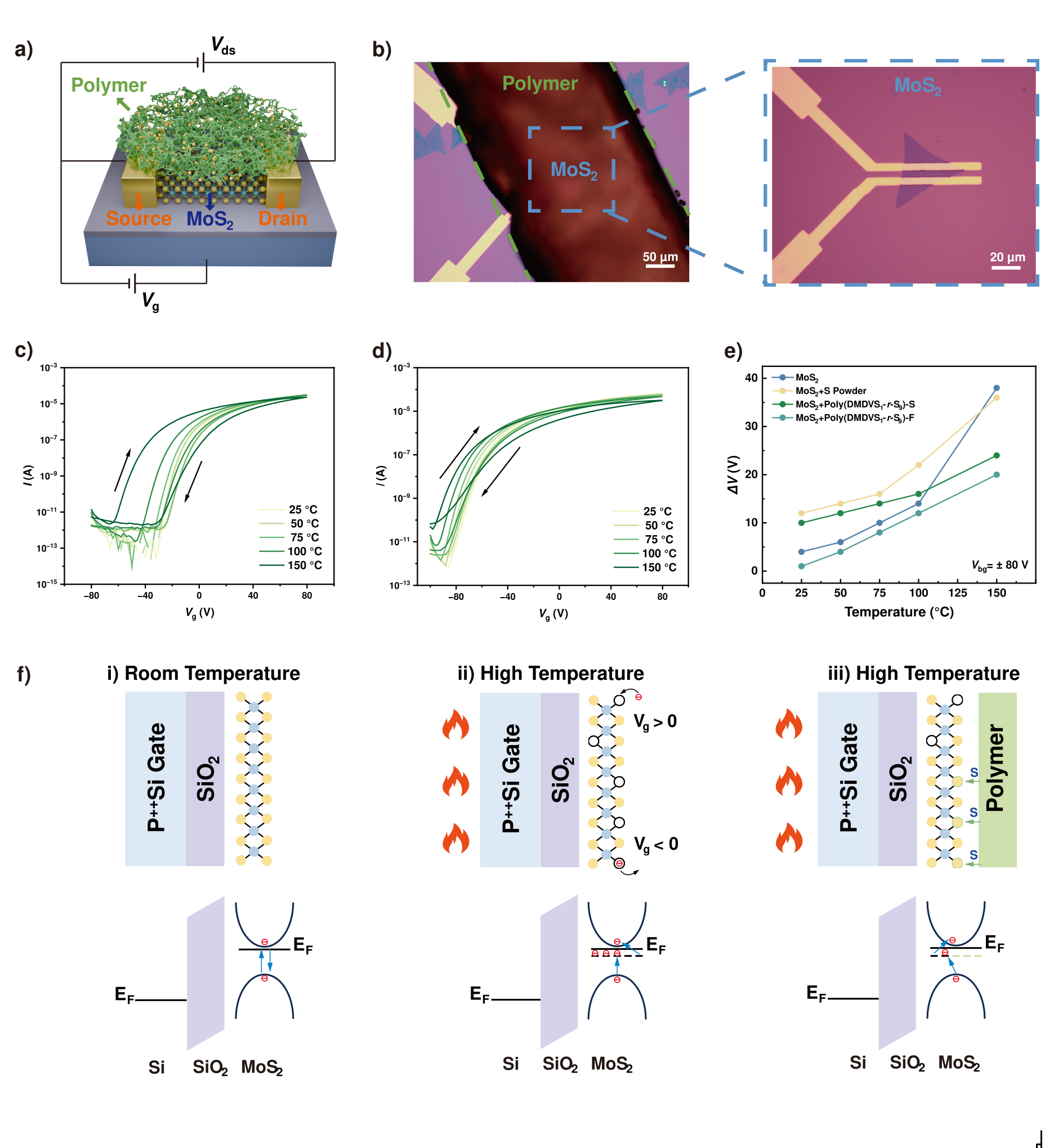 近日,上海科技大学物质科学与技术学院严佳骏课题组与纪清清课题组合作,通过反硫化技术,仅用二甲基二乙烯基硅烷与硫磺两种工业废料,成功制备出富含硫元素的动态网络高分子薄膜,该薄膜能够有效修复单层二硫化钼场效应晶体管中的硫空位,抑制器件开关迟滞现象,从而显著提升场效应晶体管的高温工作性能。相关成果发表于国际知名学术期刊Green Chemistry。