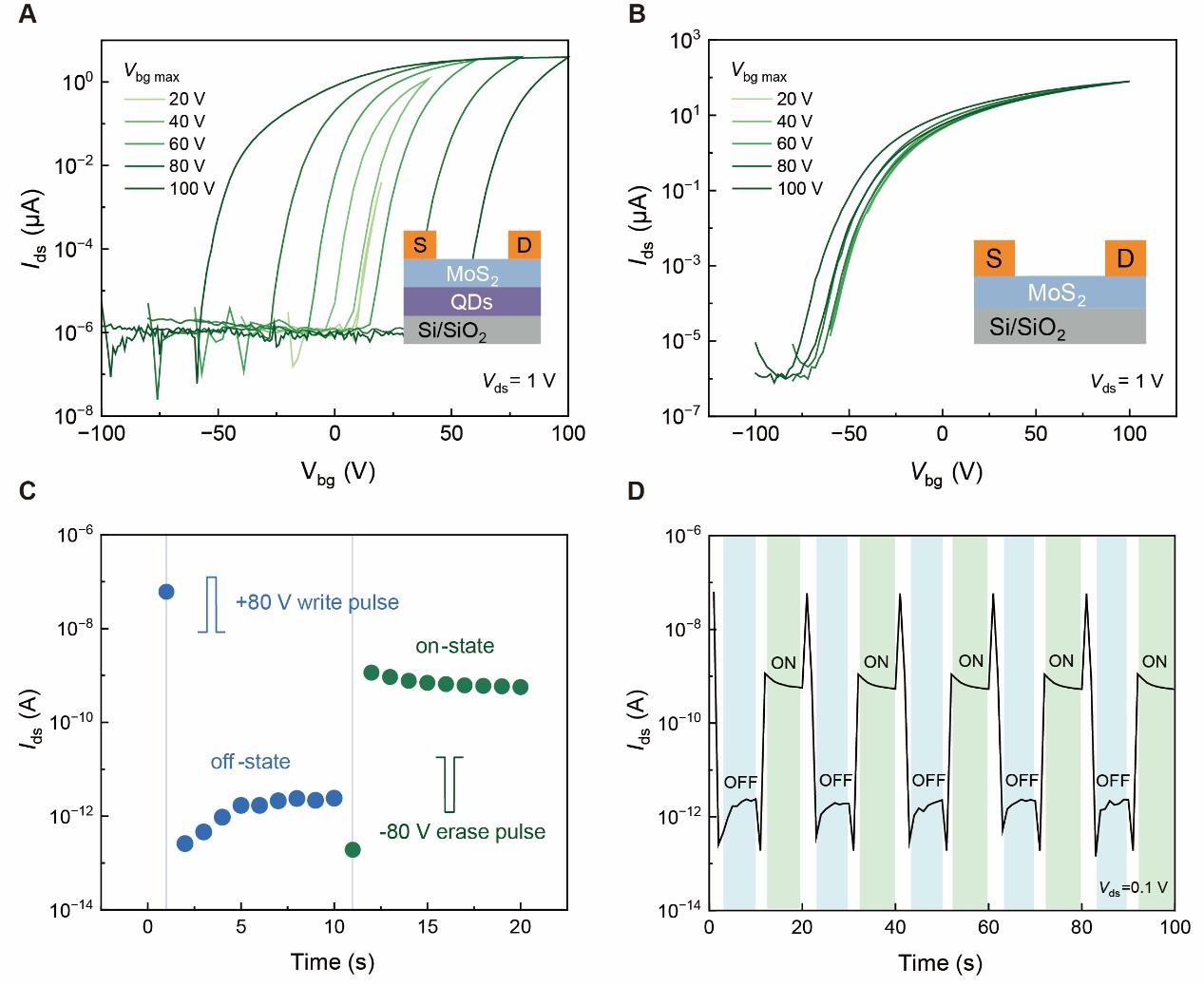 研究人员在SiO2/Si基底上制备的MoS2/QDs存储器件表现出优异的电学性能。测试结果显示,该器件在不同背栅电压扫描下均呈现显著的迟滞窗口与非易失特性,综合性能远超单一MoS2器件。此外,在脉冲栅压编程下,器件展现出稳定的开关循环能力。在撤去栅压后,其存储状态仍可被有效读取(图2)。