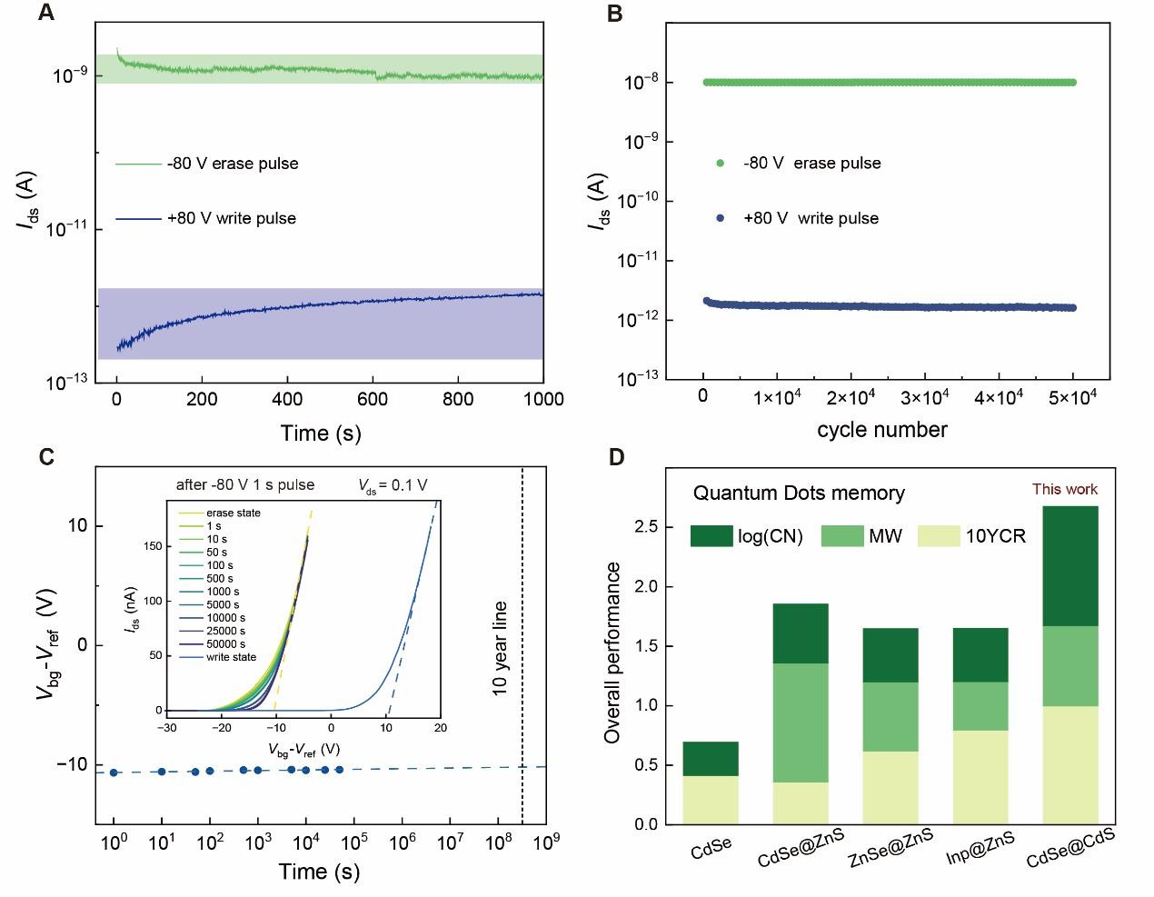 对该非易失存储器件的性能极限测试表明,器件在5万次循环测试后性能未见衰减,十年电荷保持率预计高达96.5%,展现出优异的存储可靠性与稳定性,性能优于此前报道的大多数量子点存储器(图4)。